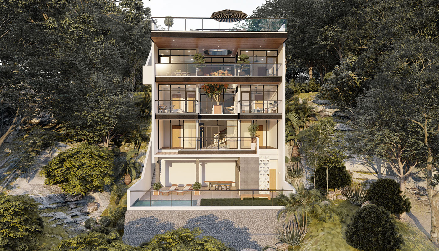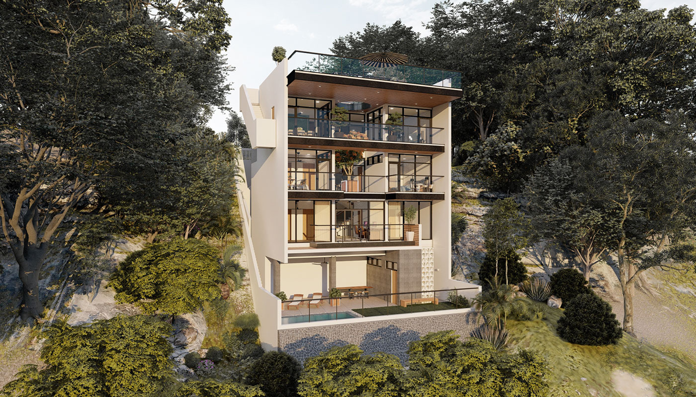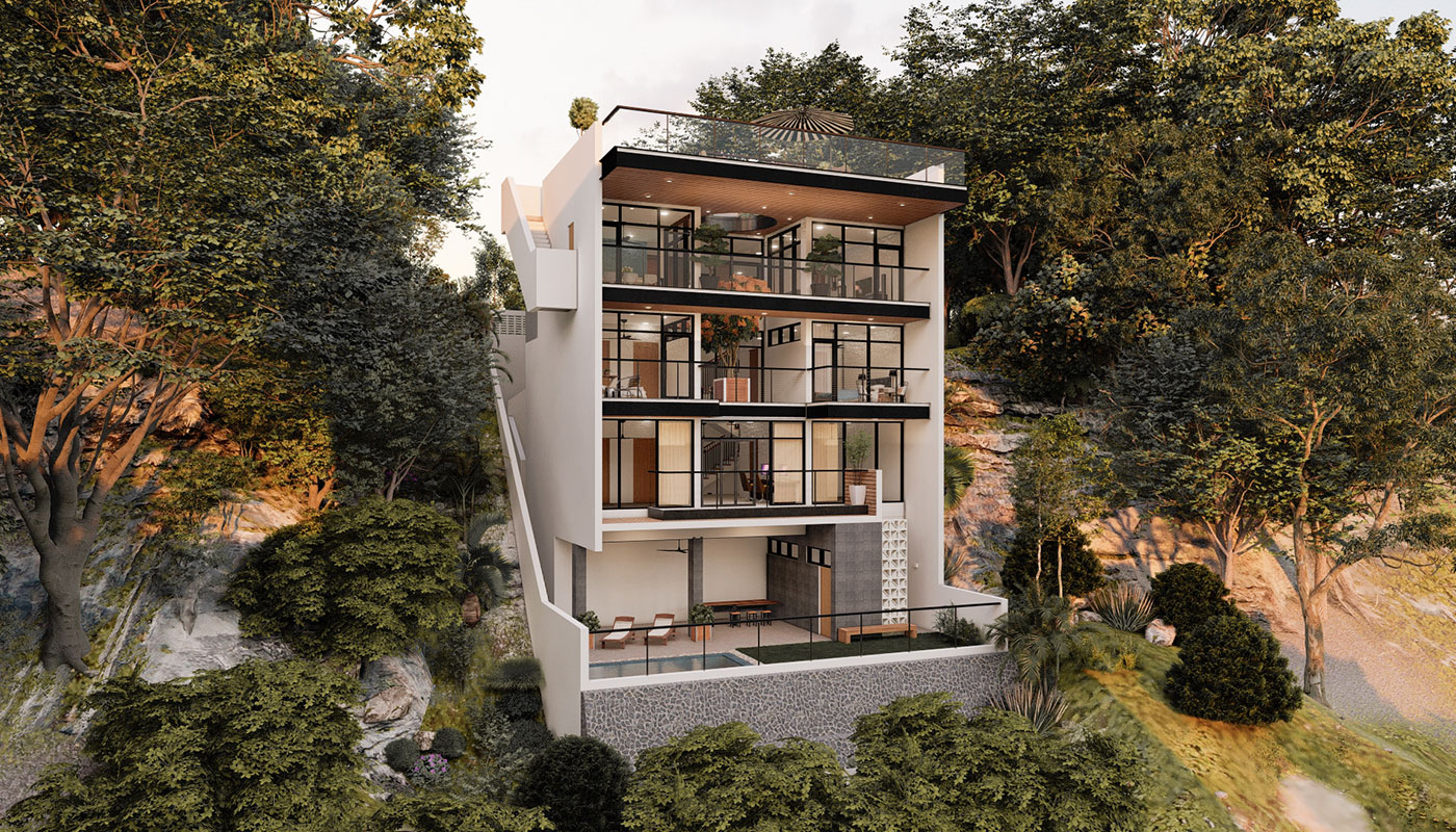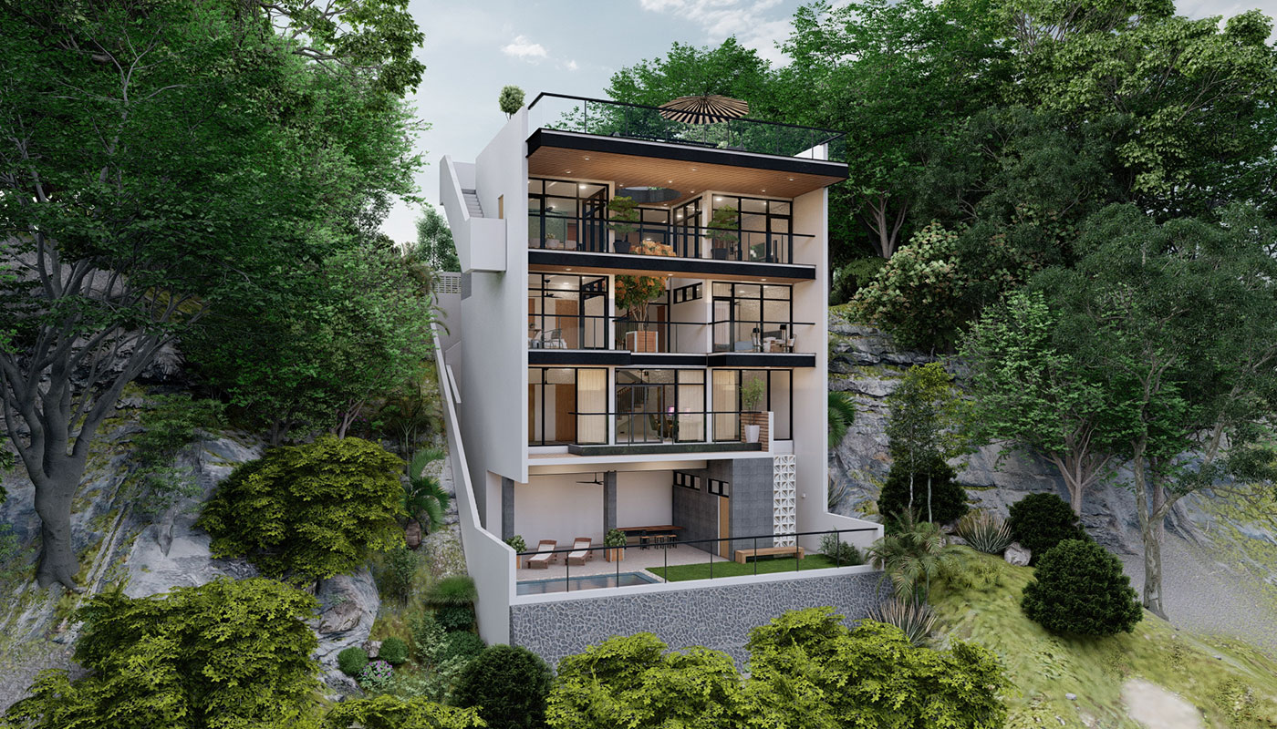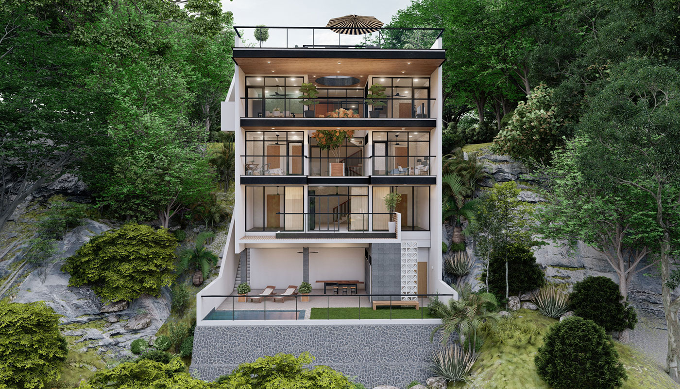 [vc_row css=”.vc_custom_1606981473870{padding-top: 4px !important;}” el_id=”abouttheproject”][vc_column][vc_empty_space height=”4px”][vc_column_text]With a slightly steeper slope, Sloping House 4 has more floors than the first 3 sloping houses. This only allows more spaces for living and sleeping areas on the sides, common spaces on the center, and a whole floor at the lowest point for recreational spaces and a pool. A deck garden can also be found on one of the floors of the house, allowing for an elevated green space. This garden has an open ceiling going all the way up to another view deck.[/vc_column_text][/vc_column][/vc_row]