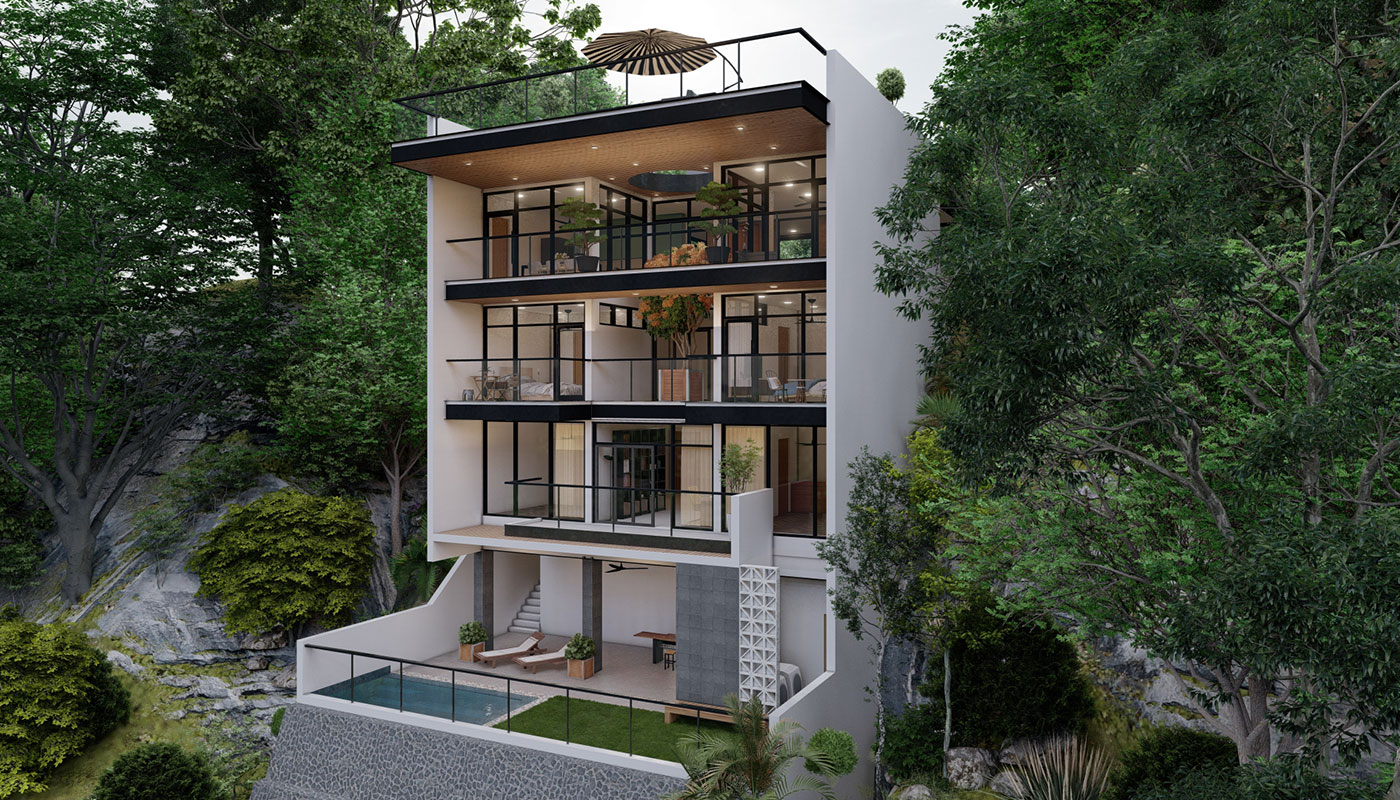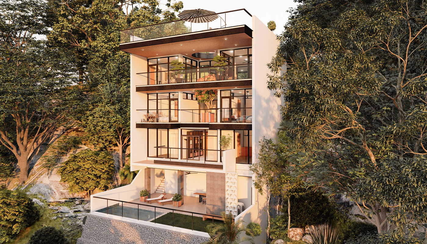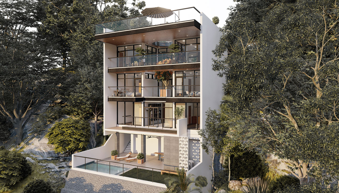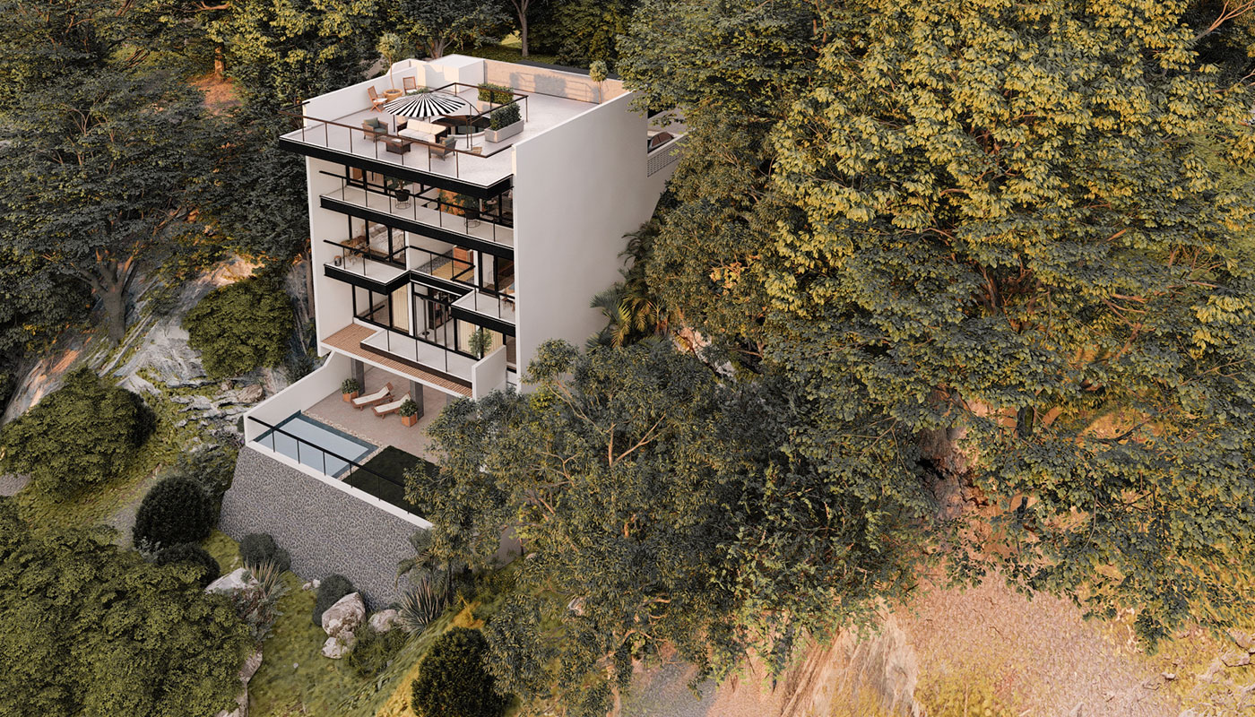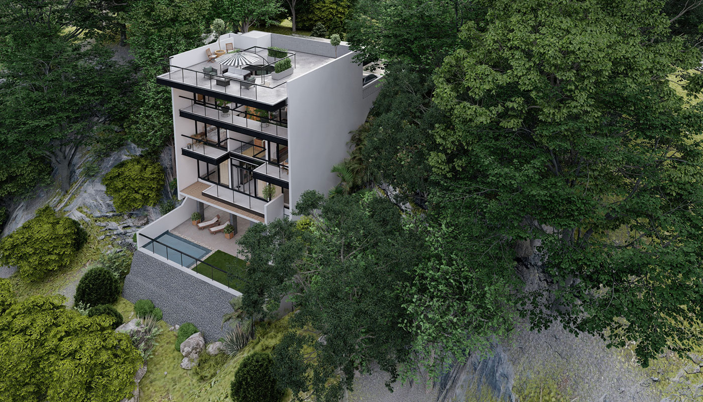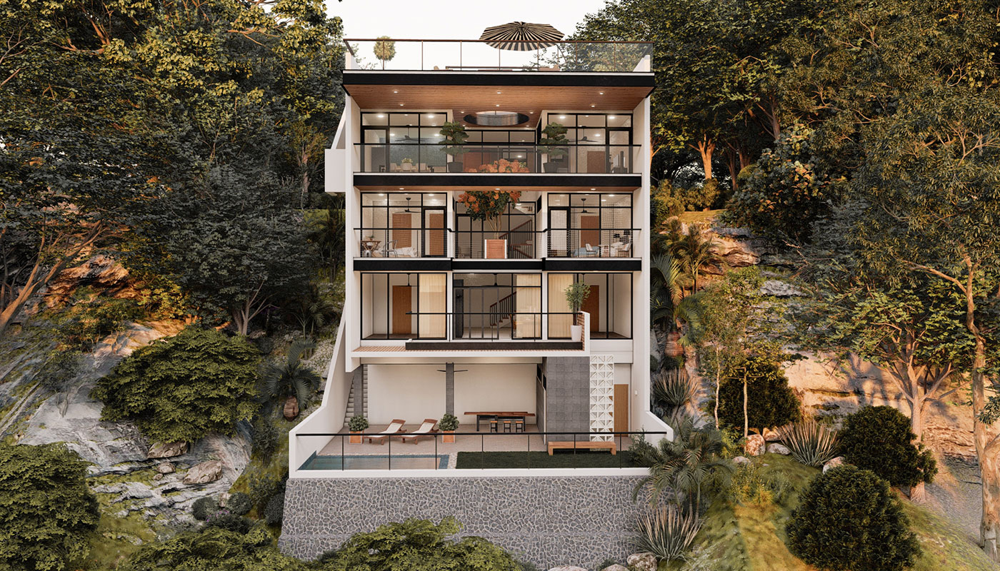 [vc_row css=”.vc_custom_1606981473870{padding-top: 4px !important;}” el_id=”abouttheproject”][vc_column][vc_empty_space height=”4px”][vc_column_text]With a slightly steeper slope, Sloping House 4 has more floors than the first 3 sloping houses. This only allows more spaces for living and sleeping areas on the sides, common spaces on the center, and a whole floor at the lowest point for recreational spaces and a pool. A deck garden can also be found on one of the floors of the house, allowing for an elevated green space. This garden has an open ceiling going all the way up to another view deck.[/vc_column_text][/vc_column][/vc_row]