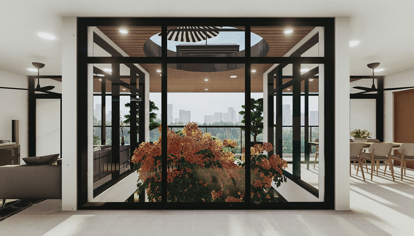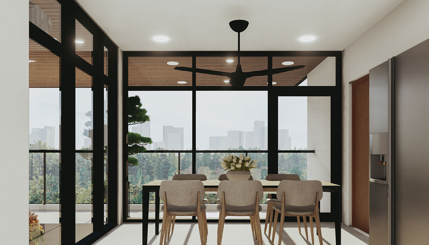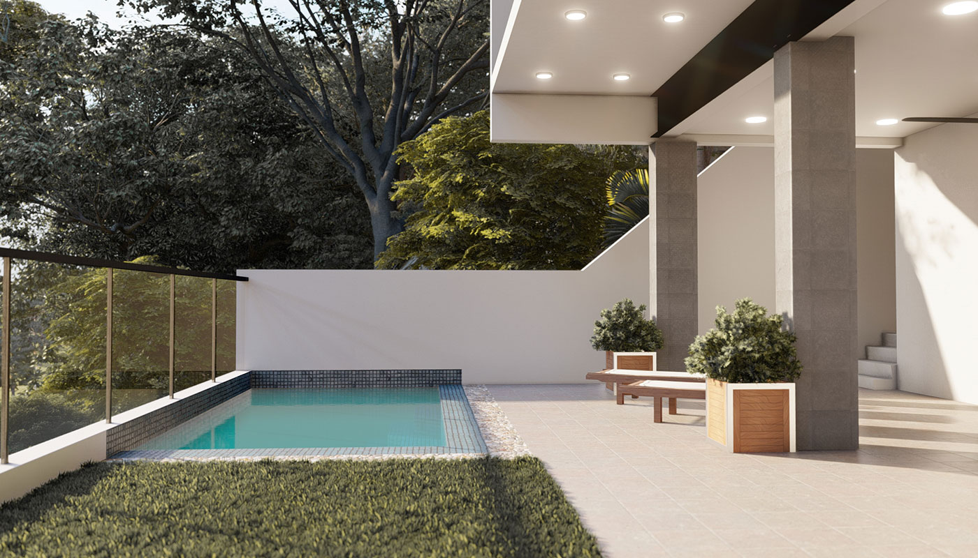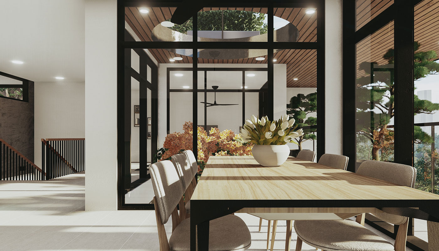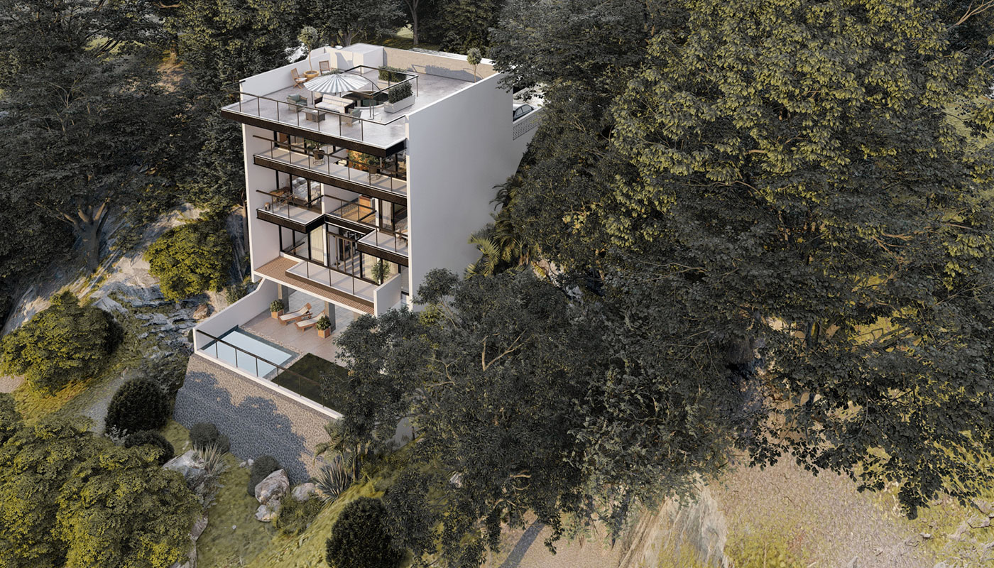 [vc_row css=”.vc_custom_1606981473870{padding-top: 4px !important;}” el_id=”abouttheproject”][vc_column][vc_empty_space height=”4px”][vc_column_text]With a slightly steeper slope, Sloping House 4 has more floors than the first 3 sloping houses. This only allows more spaces for living and sleeping areas on the sides, common spaces on the center, and a whole floor at the lowest point for recreational spaces and a pool. A deck garden can also be found on one of the floors of the house, allowing for an elevated green space. This garden has an open ceiling going all the way up to another view deck.[/vc_column_text][/vc_column][/vc_row]